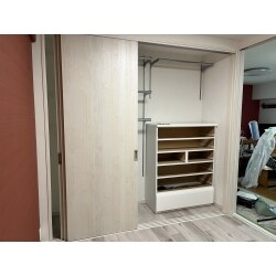 婚礼タンスが大きすぎて、押入を全開できないことにストレスが溜まり、和室を洋室にすると同時に自分好みの収納を作ってほしい とのご要望でした。 折れ戸ではなく引き戸で・洋服をたくさん掛けられるように・タンス1竿を中に置きたい など、思っておられることをたくさんお話しいただけました。