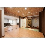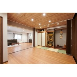 仏間とフローリングの間を間仕切りしたいとのご希望があったので、見た目にもおしゃれなTOSOのバーチカルブラインドをご提案しました。 また、お部屋を使いたいタイミングが異なる場合も考え、照明を仏間とフローリング側それぞれに設けました。 居間から和室へ入るところに6cmほど段差があったため、バリアフリーになるように床の高さを調節してフローリングを張りました。 和室特有の長押(なげし)をどこに取り入れるのか、仏間の畳(SEKISUI 美草)とフローリング(イクタ プリオス)の境界をどこにするのかなど難しいところはありましたが、奥様のこだわりを形にすることができ「イメージ通りになって大満足」との嬉しいお言葉を頂きました。