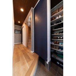 ご家族5人分の履物が収納できる大容量のシューズインクローゼットを新設しました。来客時には目隠しできるよう、引き戸も設置。空気がこもらないよう、引き戸は浮かせて換気もできるよう設計しました。