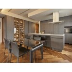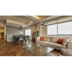 ビルの1フロアを改装して住居とするにあたり、既に他社にて解体工事まで進んでいましたが、設計上の行き違いのため工事が途中でストップ。その後、当社にご相談をいただきました。使いやすい生活動線、アイテム・量に合わせた収納など考慮した間取りをご提案し、工事を引き継ぐこととなりました。壁面は装飾し、床材は幅広のヘリンボーンを採用。そして天井は梁を活かしたデザイン性の高い仕上がりとしています。ビルの1フロアを住居に変更するにあたり、気密性・断熱性および換気性能などの住居環境も改善しています。
