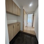 玄関収納を20センチほど浮かして、玄関の見えるところに普段履きの靴を置かなくてもいいようにしています。ツヤのあるフロアタイルが高級感を出しています。