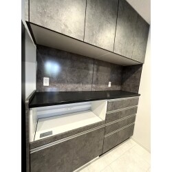 カップボード新設のご依頼でございました。 既存キッチンに併せた商品をお客様ご自身でご選定いただきました。 背の高いものも余裕で収まる豊富な収納力にて、家電やダストボックスの収納もおこなえて、とてもお使いいただきやすいカップボードになりました。