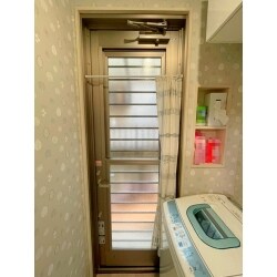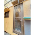 FIX窓の欄間部分と本体ドア部分からなる勝手口。網戸がなく、ドアクローザーもご自身で撤去されたとの事で、開閉に不安があり、開きっぱなしになるため、防犯面でも心配がありました。