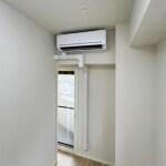 お部屋を中央で間仕切り、新しいエアコンとシーリングライトも一台ずつ追加しました。壁に新しいエアコン用ドレン管の穴を開けることなく、元もとあったエアコンのドレン菅と合わせてすっきりまとめました。右側のお部屋からも仕切り壁の隙間から窓を開いてベランダに出ることが出来ます。