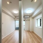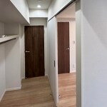 左側のお部屋を2つに分離し、ウォークインクローゼットは二つのお部屋からアクセスできる共有の通路にしました。写真右手前にあった収納棚を取外し、新しい壁を造設。普段収納部が見えない隠れた共有収納スペース兼通路が完成しました。