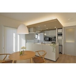キッチンはフルフラットのペニンシュラ型に変更し開放感のあるLDK空間。折り下げ天井には、間接照明をプラスして、空間に奥行きと広がりが生まれ、穏やかな光が柔らかく包み込んでいます。