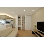和室を洋室に変えリビングと一体化。リビングの一角には見せる収納と隠す収納を上手く使い分け開放感のあるLDKをスッキリとおしゃれに仕上げました。壁掛けTVとオープン収納の背面にはグレージュのアクセントクロスを貼り、余白のある居心地のよいリビング空間に仕上がりました。