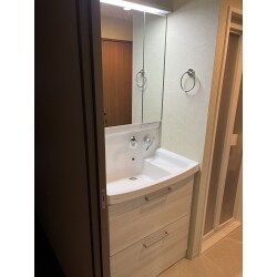 ご入居当時から使用されている洗面化粧台は経年劣化のため洗面ボウルの汚れなどが取れず、開き扉のキャビネットも収納が少ないとご不満でした。