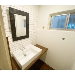 お客様支給の洗面所鏡は、洗面器と白いレンガ調クロスと調和がとれて、お洒落な洗面所に仕上がりました。イメージ通りに仕上がったと大変喜んで頂きました。