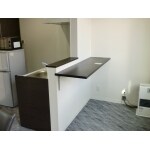 ミニキッチンを部屋の中央に配置し、向かい側にカウンターを設置して飲食スペースにしました。