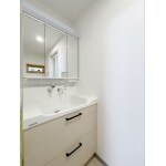 洗面小物収納が隠れる3面鏡の洗面化粧台へ