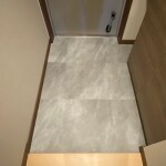 背の高いお客様がご使用されやすいよう、また収納力を増やして洗濯機上の棚を2段にしました。床には高級感あふれる大理石調のクッションフロアを提案しました。