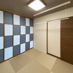 元々6畳だった和室は、息子様ご家族が遊びに来たときのためのゲストルームとして、4畳半にサイズダウンして、お洒落な市松模様の琉球畳に変更しました。お客様用お布団が十分に入る使いやすい仕様のクローゼットタイプの引き違い戸に変更し、和室の建具にもしっくり調和するLIXILラシッサSのクリエモカ色を採用しました。天井に配置したアクセントクロスと調和してデザイン性を高めています。そして一番目を引くポイントは、琉球畳に合わせた、間仕切り折戸の紺と白の市松模様です。広いリビングのスクエアデザインをお洒落に引き立てる和モダンな空間が生まれました。