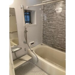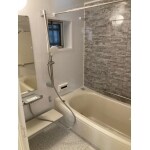 浴槽横を、グレー系の中でもお好きな色合いお選びいただき、以前の浴室と雰囲気をガラッと変えました。しっかり換気ができるよう窓を設け、雨天時など浴室に洗濯物が干せるよう、物干しも設置しました。