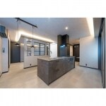 お⺟様と 同居するため、二世帯住宅にリフォームしま した。こちらは2階のリビング。壁や天井は全体的にグレーで統一することで、高級感を持たせています。
