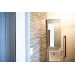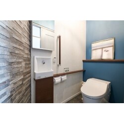 タッチレス水栓は寸法通りに穴を開けないといけないため、難しい工事ではありましたが、問題なく設置できました。 「今後のために手すりを付けたい」とのご希望もあり、使いやすい位置に取り付けました。また「トイレの扉もこの機会に変えたい」とのことで、扉の開閉時に広さを損なわない引き戸に変えています。 壁には、消臭効果がありデザイン性も優れたエコカラットを使用しました。 「使い勝手の良いトイレに変わり、落ち着いた色味の内装もとても気に入っている」と仰っていただけました。