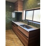 クリナップのステンレスキッチンで、清潔長持ち! 傷や汚れに強いセラミック天板は、シックな扉色にピッタリの素材です。 壁は地元、美濃焼のタイルを使用しております。