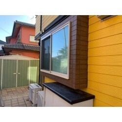 国産の商品に変更致し、工事の際に外側窓周りの色を外壁の黄色によく合う茶色で塗装致しました。