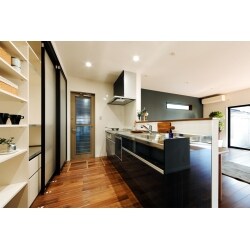 大容量の収納棚でスッキリ収納。ペニンシュラキッチンで開放的な空間に。