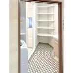 コーナーを利用して可動棚を提案しました。 洗面台は大きなボールでキャビネットは収納の多いタイプをお勧めしました。