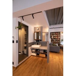広々LDKの中で、脱衣所とも繋がる場所に洗面台を設置しました。斬新なアイデアですが、空間と調和するようデザインし、造作いたしました。脱衣所に無理やり詰め込むのではなく、各スペースの確保や使い勝手も考えた配置にしました。