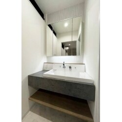 洗面台の状態は綺麗でしたが使い勝手の悪さがお悩みでリフォームを決意されました。ボウルが浅く水ハネや洗濯物のつけ置き洗いなどが困難でした。施主様がSNSで発見して気に入られたボウルの深さが魅力のLIXIL「ピアラ」での造作洗面がご希望でした。 ミラーは既存を再利用し、ボウルの交換やコンセント一の変更やオープン棚を取り付け等使い勝手にこだわっています。 既存のアクセントクロスに合わせてシックな色味を選定しました。オシャレな雰囲気を損なわず機能性を高めた洗面台を見てお喜び頂けました。
