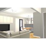 梁の位置より向こうに間仕切りを設置し、LDK全体を広げています。テレビの位置を変え、コーナーを利用して、大きなソファを設置できるようご提案しました。エアコン、内窓もあらたに設置しています。