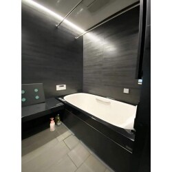 こだわりのある水回り空間に仕上がりました。使用製品はL社製品を選んでいます。 浴室はブラックを基調としたパネルと浴槽。お洒落なライン照明は圧倒的な高級感とお洒落さ感じさせます。 洗面はミラーを再利用し、洗面台とミラーの間にはモザイクタイルを貼っています。タイルが良いアクセントになっていますね。