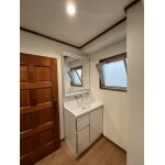 洗面化粧台の交換をおこないました。カウンターに段差がございます為、幅広く使い分けいただける洗面化粧台となっております。