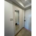 お客様がご用意した鏡と、エコカラットを貼っておしゃれな雰囲気に。エコカラットはLIXILが開発した調湿・脱臭効果のある内装用タイルです。機能性はもちろん、デザイン性も豊富でより自分好みの空間に仕上げることができます。