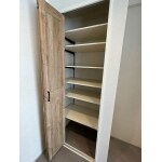 無垢のキッチンを対面にし、コンロ側の壁と正面に白タイルを貼りました。キッチン背面には、パントリーとシェルフを設置し、収納面の問題もクリアにしました。