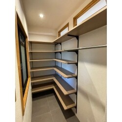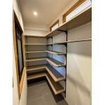 間取り変更をし、シューズインクロークが新設できるようスペースを確保しました。棚は可動式にしてお好きな高さに変えられるように。ハンガー掛けも設け、アウターやカバンなども一緒に片付けられるようにしました。