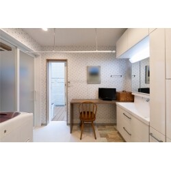 洗面室はさわやかな印象に。洗面室から直接、外で洗濯物が干せるようドアを設置し、目隠しのロールカーテンも設けました。雨天時は中で干せるように、脱衣所にも物干しを設置しました。