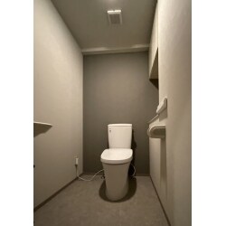 背面のグレーのアクセントクロスをベースに床や巾木の色を合わせて、落ち着いたトイレ空間に仕上がりました。