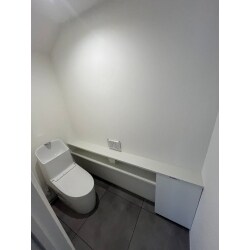 白を基調とした空間づくりをし、シンプルで清潔感のあるトイレに。締め色として床材にダークグレーを採用し、おしゃれさをプラスしました。