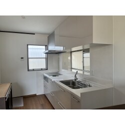 大容量の収納スペース。L字型のシステムキッチン