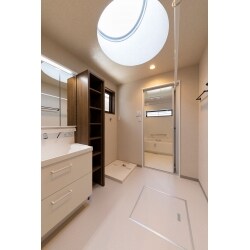 白を基調とし、シンプルで使い勝手のいい洗面室をご提案しました。洗面台はLIXILのMVw750を採用しました。