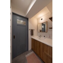 木のぬくもりを感じる無垢の木洗面台を採用し、照明やミラー白タイルなどこだわりのアイテムを合わせました。扉は、洗面台との相性もいい、お施主様お好みのカラーを取り入れました。