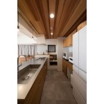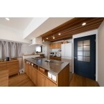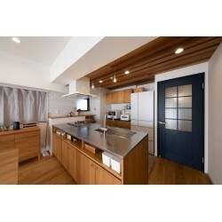 キッチンはウッドワンのスイージーを採用し、天板にステンレスを合わせました。家事効率や機能面も抜群の空間に。天井部は小上がりと同じ木目調にし、おしゃれさをプラスしました。