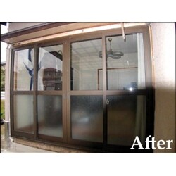 お客様より以前から悩みをお聞きしており、今回重くて開閉が困難なサッシを分割して 1枚の重さを軽くする4本引への変更をご提案しました。これだけ大きなサッシなので、レールがかなり垂れていました。そこを調整しながら新しいサッシの取付を行いました。