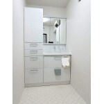 T社のサクアを設置致しました。 今回は設置向きを大胆に変更させて頂きました。以前、洗濯機があった場所に洗面台を設置することで、動線が広くなり、移動がラクになりました。 収納スペースは洗面横のトールキャビネットで確保しており、その他三面鏡の裏スペース、引き出し式の収納で収納力は十分あります。