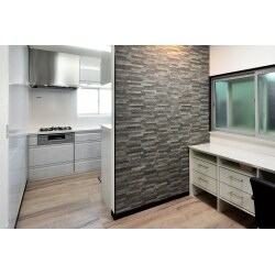 ダイニングに収納があったらと新たにカウンターを設置しました。軽い食事をとったり、ノートパソコンを開いたりと想像以上に使い勝手がよくて大満足とのこと。新たに壁を作りリビングダイニングから冷蔵庫やキッチン収納が見えないようにしました。ダークカラーのエコカラットを貼ったことでアクセントが加わりました。
