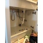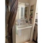 鏡裏に収納もあり、シャワーカラン、一体型混合栓の 洗面化粧台に交換いたしました。 使いやすくなったと、お客様の感想も上々でした。