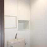同じ仕様と形状の3段壁埋込収納ですが横幅を広げ、棚板・地板に白ポリ合板を貼りました。サイズを少し広げトイレットペーパーや掃除用品などの収納力も向上しました。