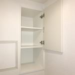 埋込タイプの3段収納棚が備え付けられていました。上2段は扉付ですっきり収納できる仕様でした。