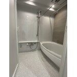プラナスグレーウッドのアクセントパネルとゆったりとしたワイド浴槽でくつろぎの浴室が出来上がりました。