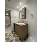 ラフスモークウッドの木目が可愛い、2段引出オープン棚仕様のドレーナと木枠一面鏡にストライプ柄のクロスと濃淡差のタイル印象的な石目柄クッションフロアでヨーロピアンな印象の洗面空間に設えました。