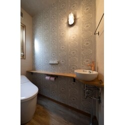 お気に入りのクロスをお選びいただき、照明や手洗いボウルなどすべてが調和するよう一緒に検討していきました。手洗いカウンターは使い勝手の良いシンプルな形で造作しました。