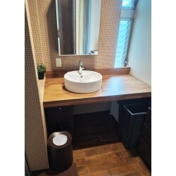 LIXIL(リクシル)サティスのおしゃれな洗面ボウルで造作の洗面台をご提案させて頂きました。現状が、四角の洗面ボウルの為イメージを変えるために丸型の洗面ボウルをお選び頂き工事ご依頼となりました。