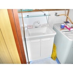洗濯機との干渉、使いやすさを考慮して600mm幅のシングル混合水栓タイプの洗面台を選定してご提案しました。 また、壁にパネル材を設置して、水はねの汚れを軽減できるタイプをおすすめしました。